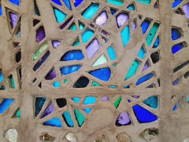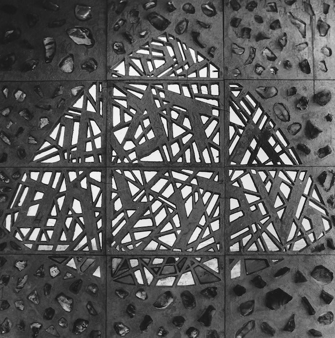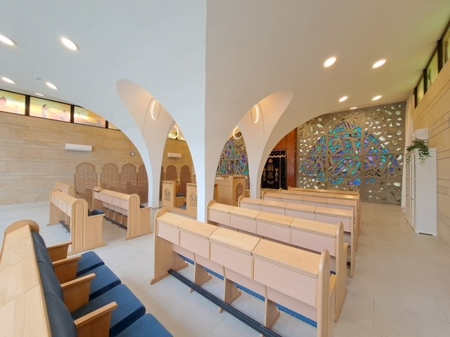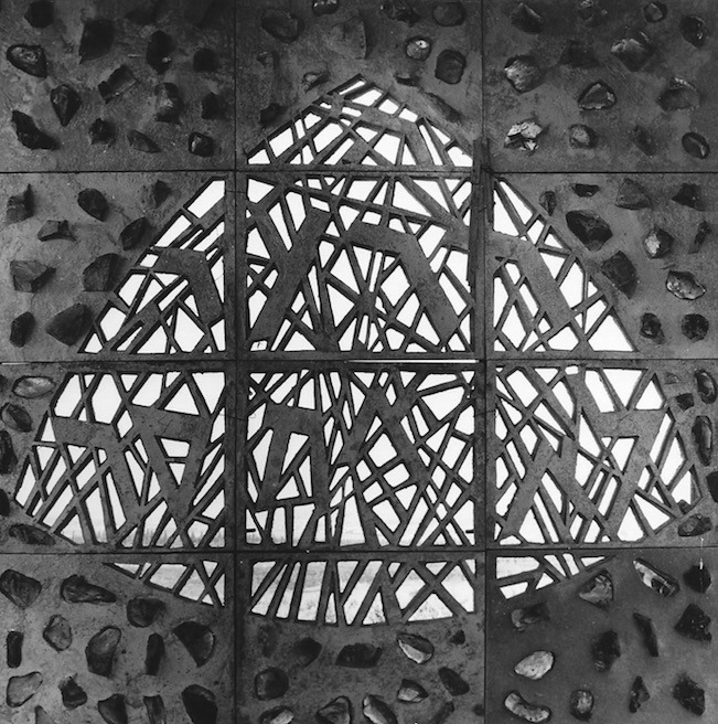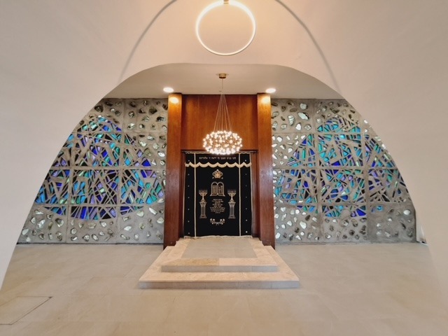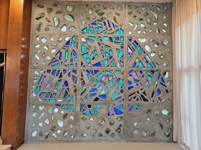 Stylised script of from Proverbs 28 (עובד אדמתו ישבע לחם – He who tills the land shall have plenty of food) and Psalm 23 (ה’ רועי לא אחסר – The Lord is my Shepherd, I shall not want) is part of the motif of these windows.