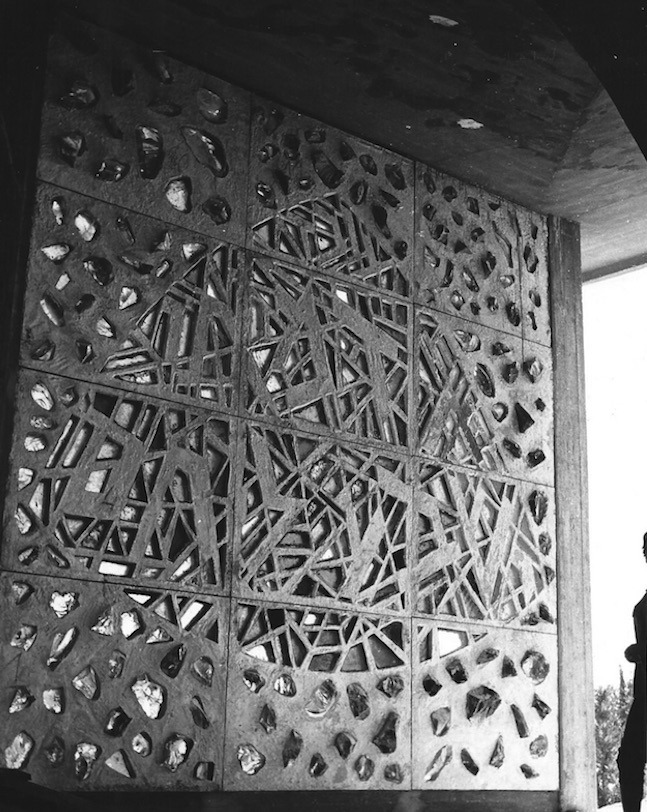 Concrete and chunk glass wall.