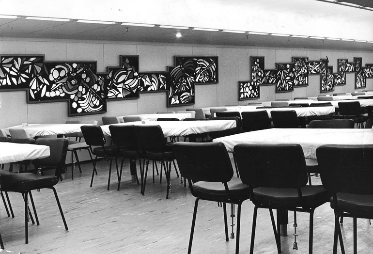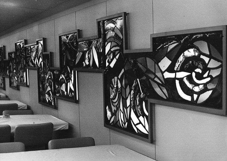 ‘FRUITS OF THE BIBLE’: Stained glass windows for main dining hall. Stained glass panels metres long and 30 metres in total, thin sheet and chunk coloured glass set in black epoxy, fiberglass reinforced both for light weight and vibrations of motors.